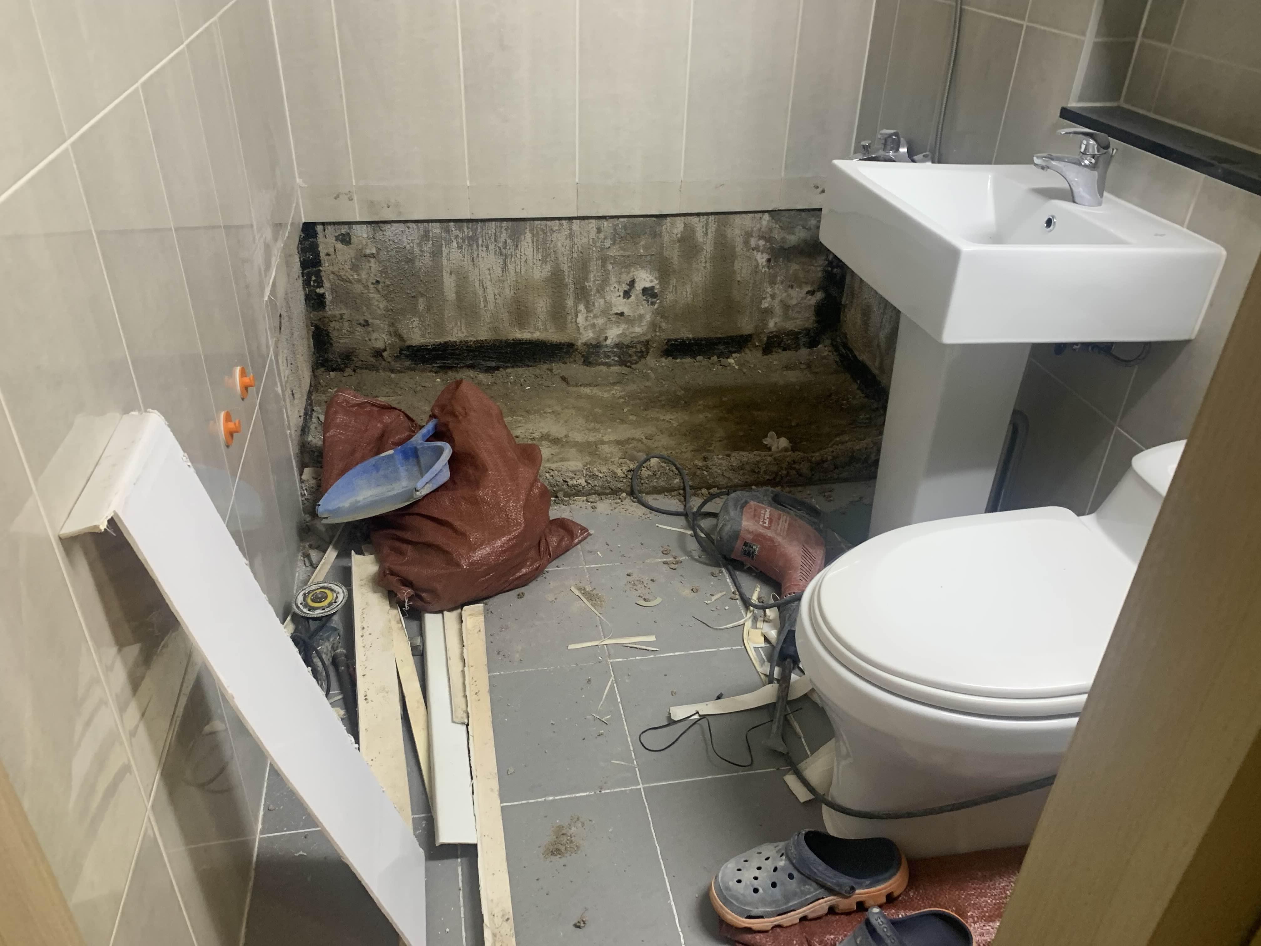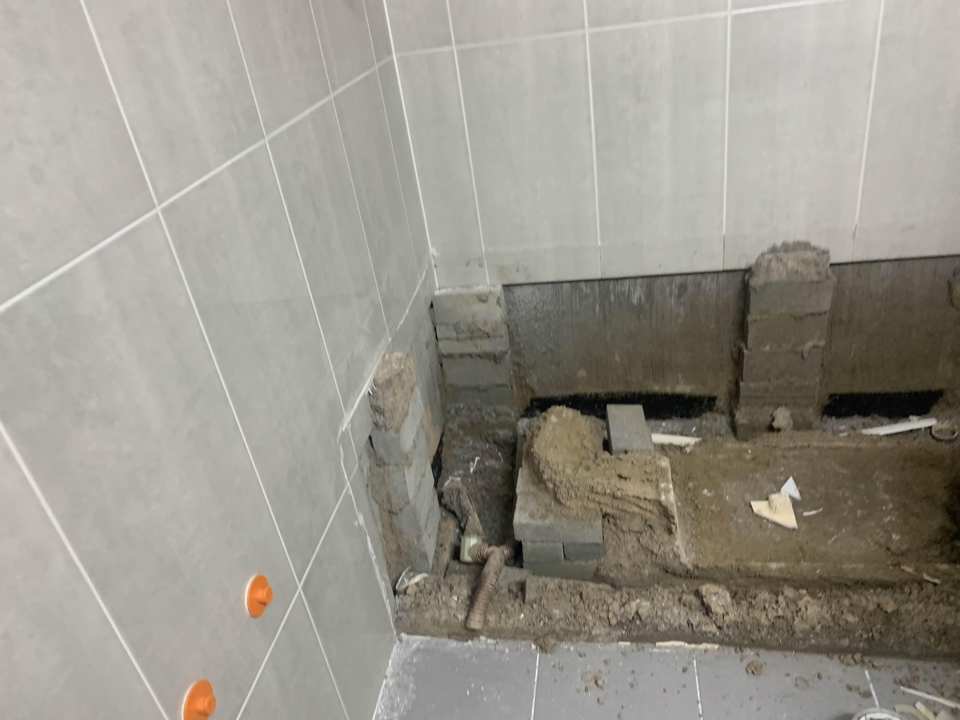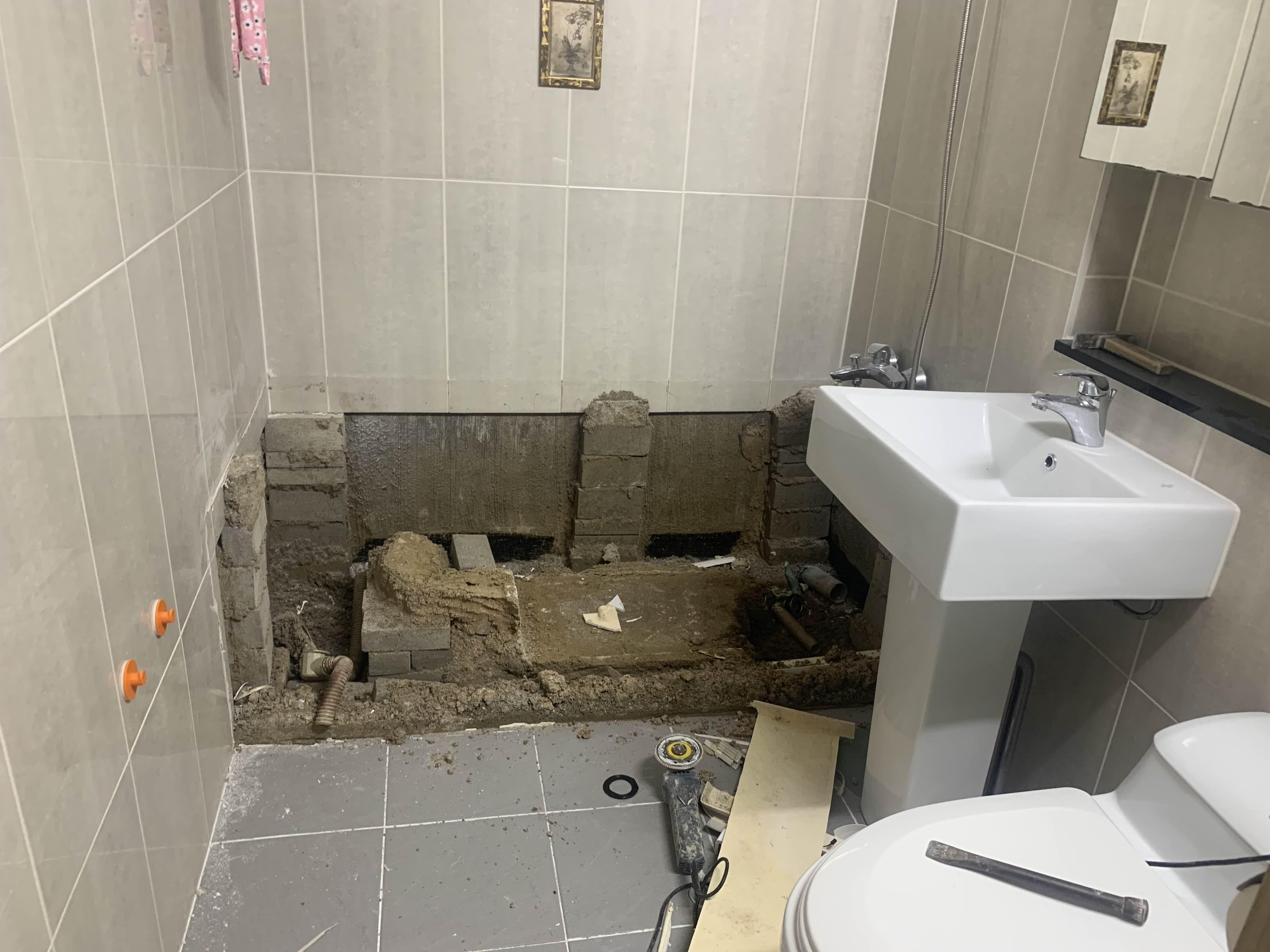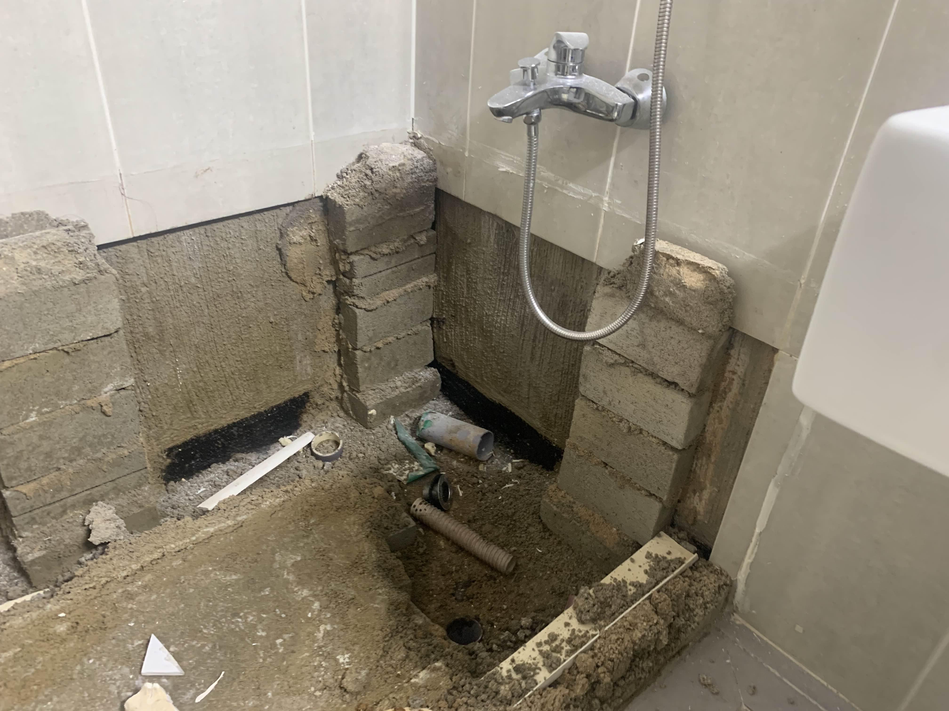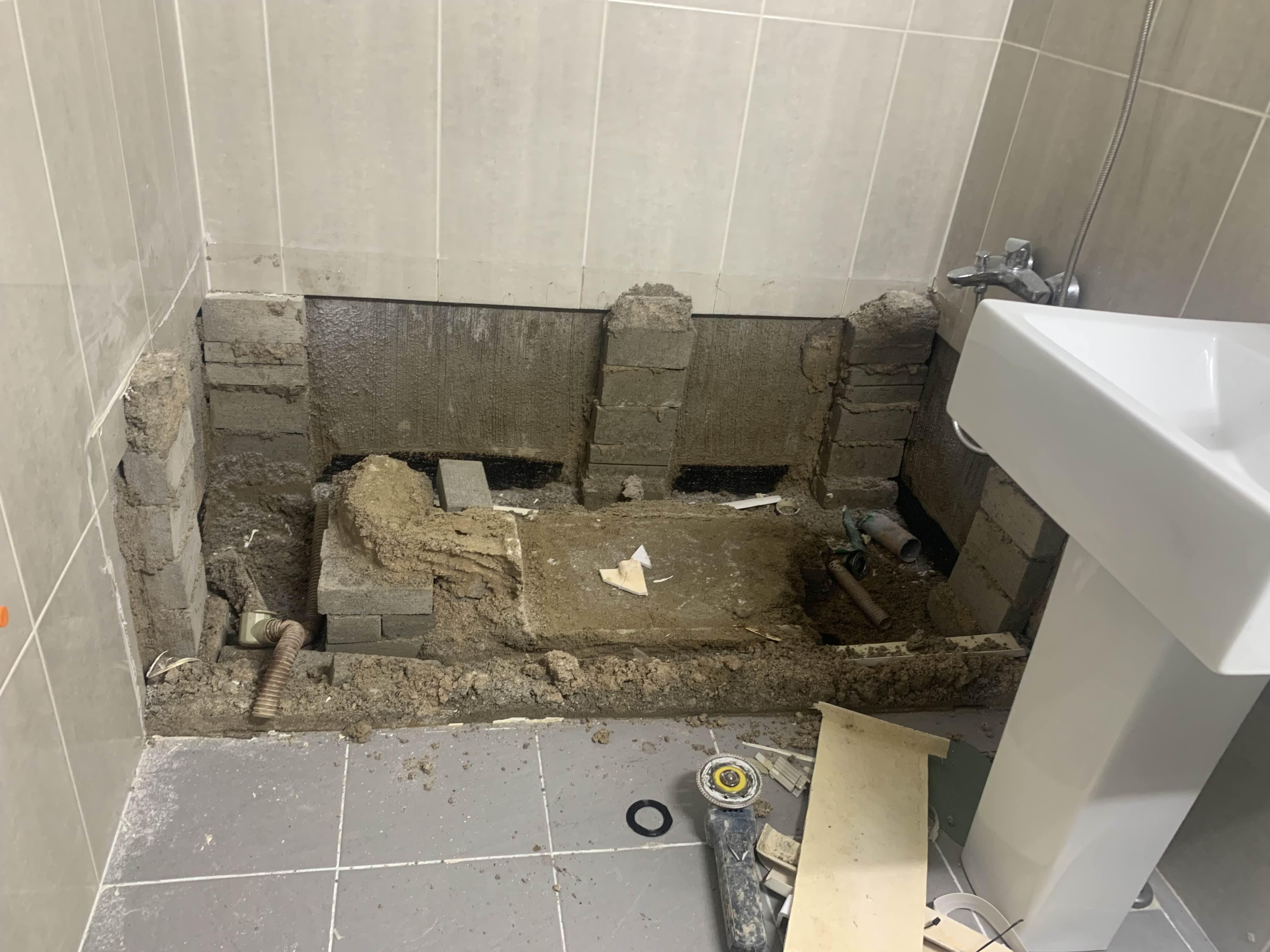 욕조를 철거 후 욕조 거치대(벽돌)를 제거 후 청소한다. 청소가 다 끝나면, 욕조 하부 쪽 방수층이 보인다. 육안으로는 방수가 깨졌는데, 안되었는 모른다.ㅎㅎ
