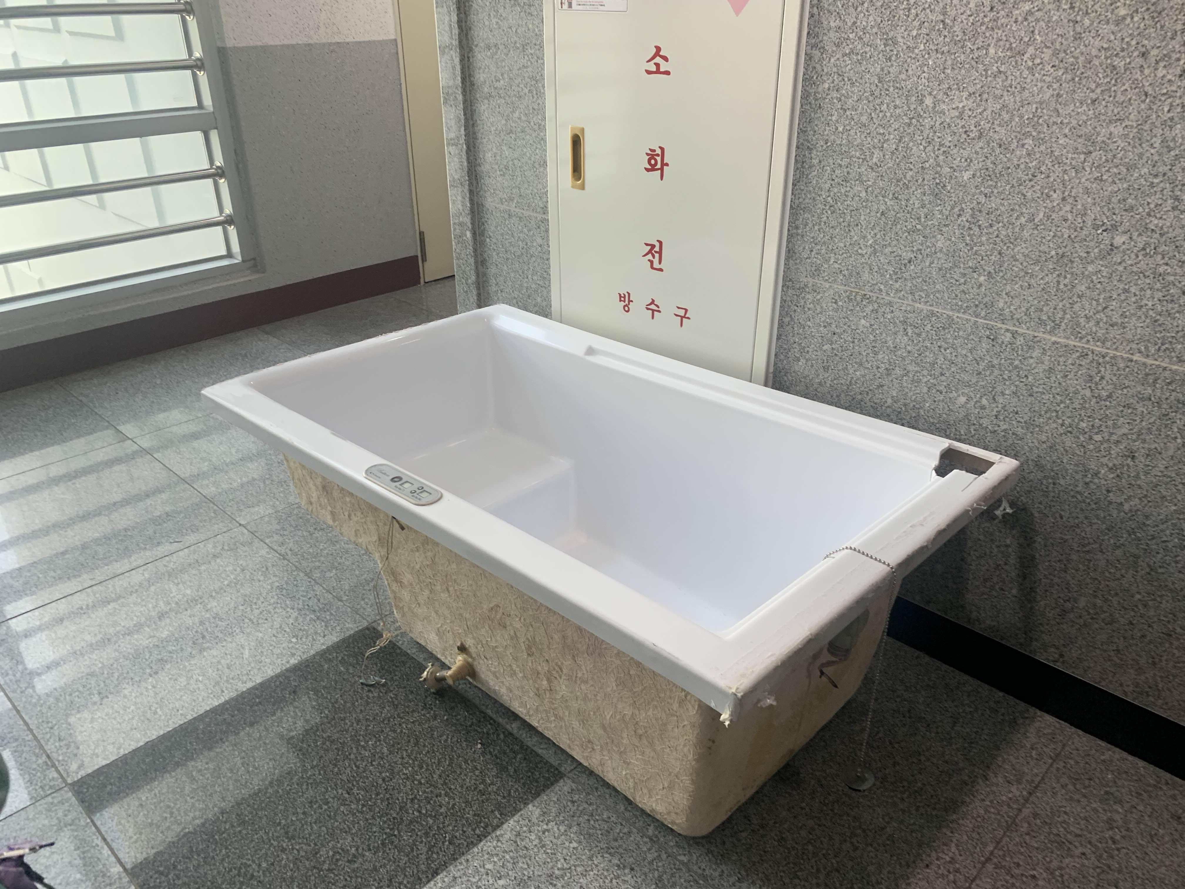 욕조 하부의 배수구를 막을지, 배수구를 살질지 결정해야 한다. 욕조 하부의 배수구가 세면대 아래쪽(욕조의 중간 부분에서 세면대 아래쪽)에 있었으면, 나중에 샤워부스 설치하고 배수하는 라인이 괜찮을 거 같아서 놔두려고 했지만.... 배수구 위치가 애매하다. 기존 세면대 쪽 배수구와 가깝다. 그래서, 막는 거로 결정했다.