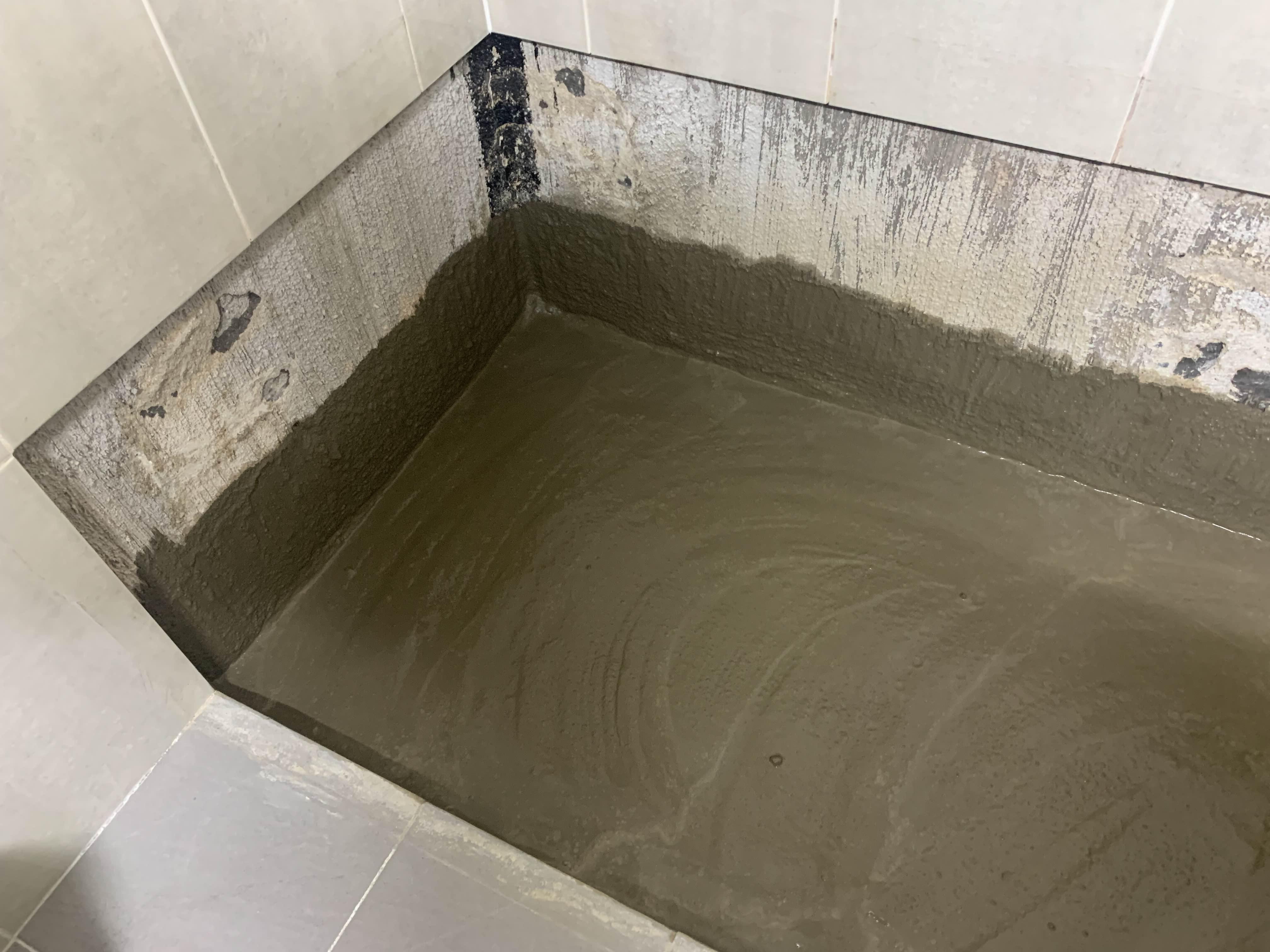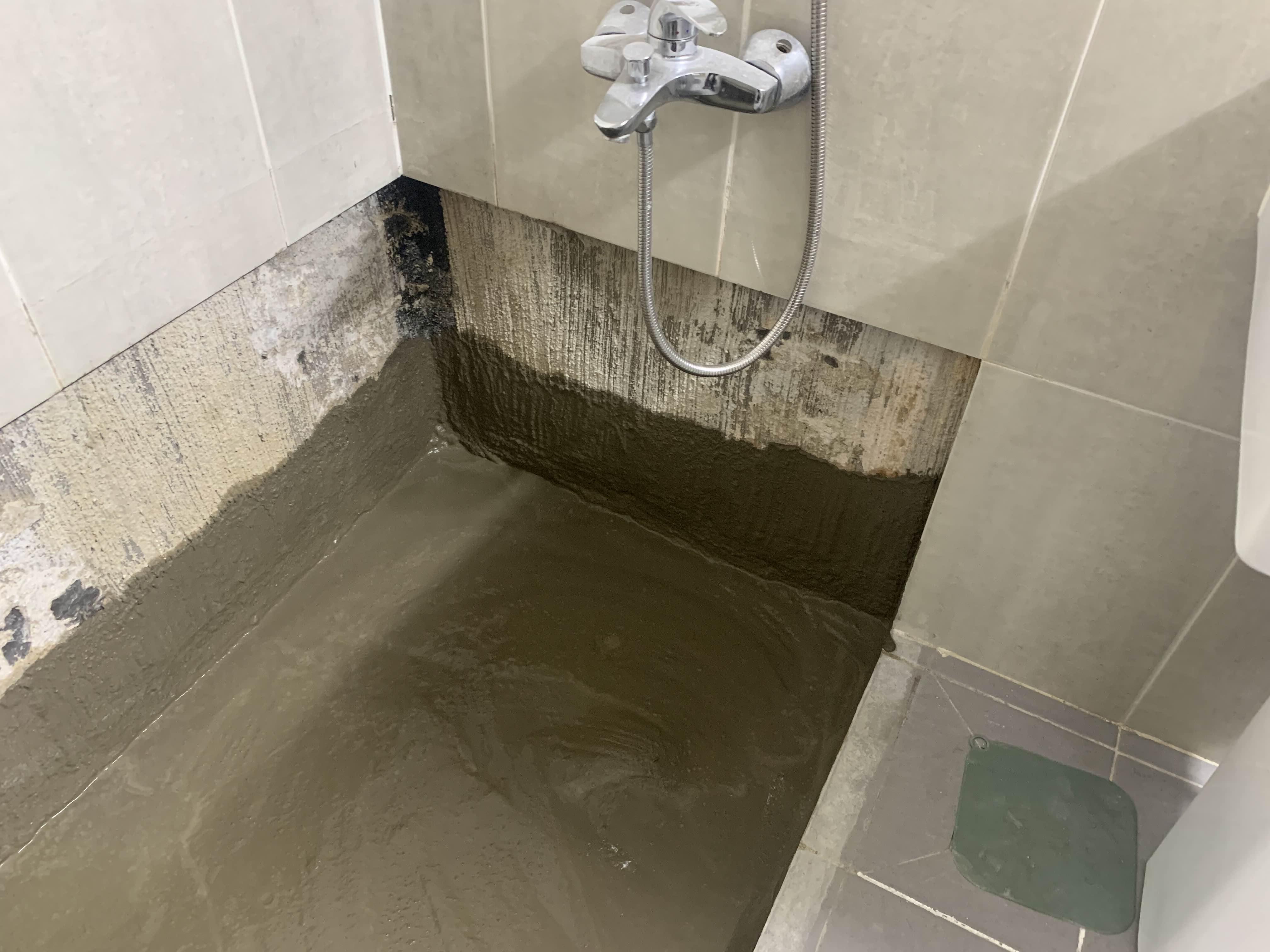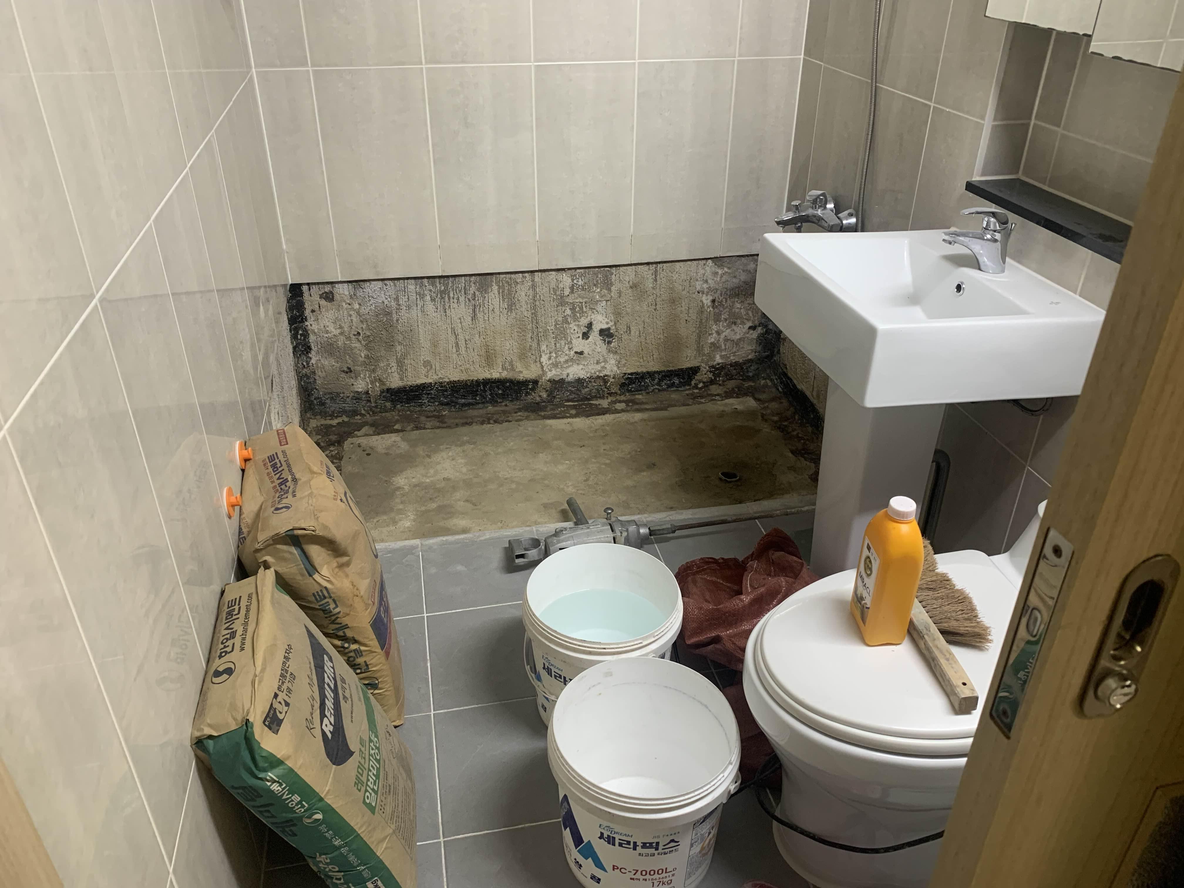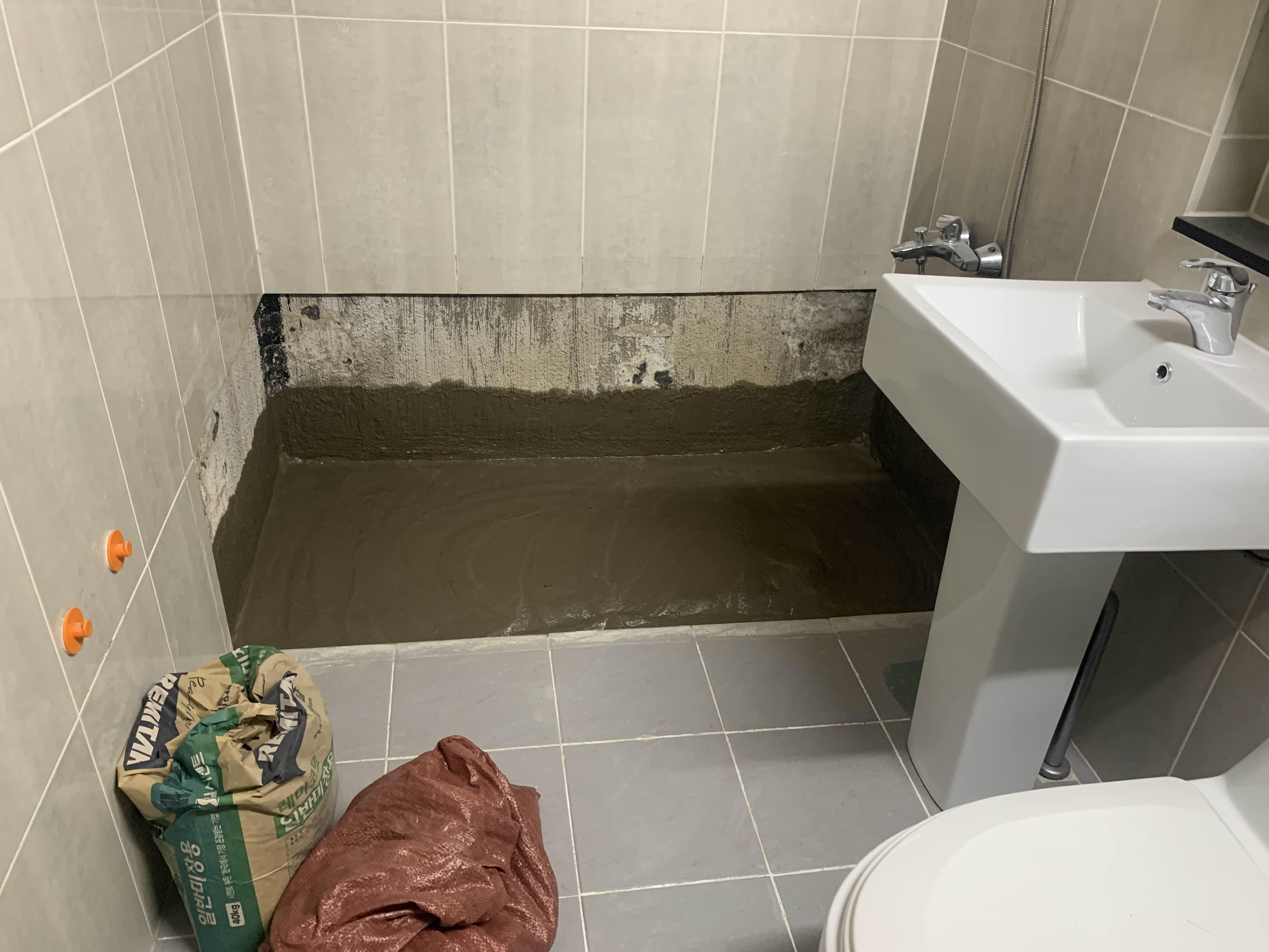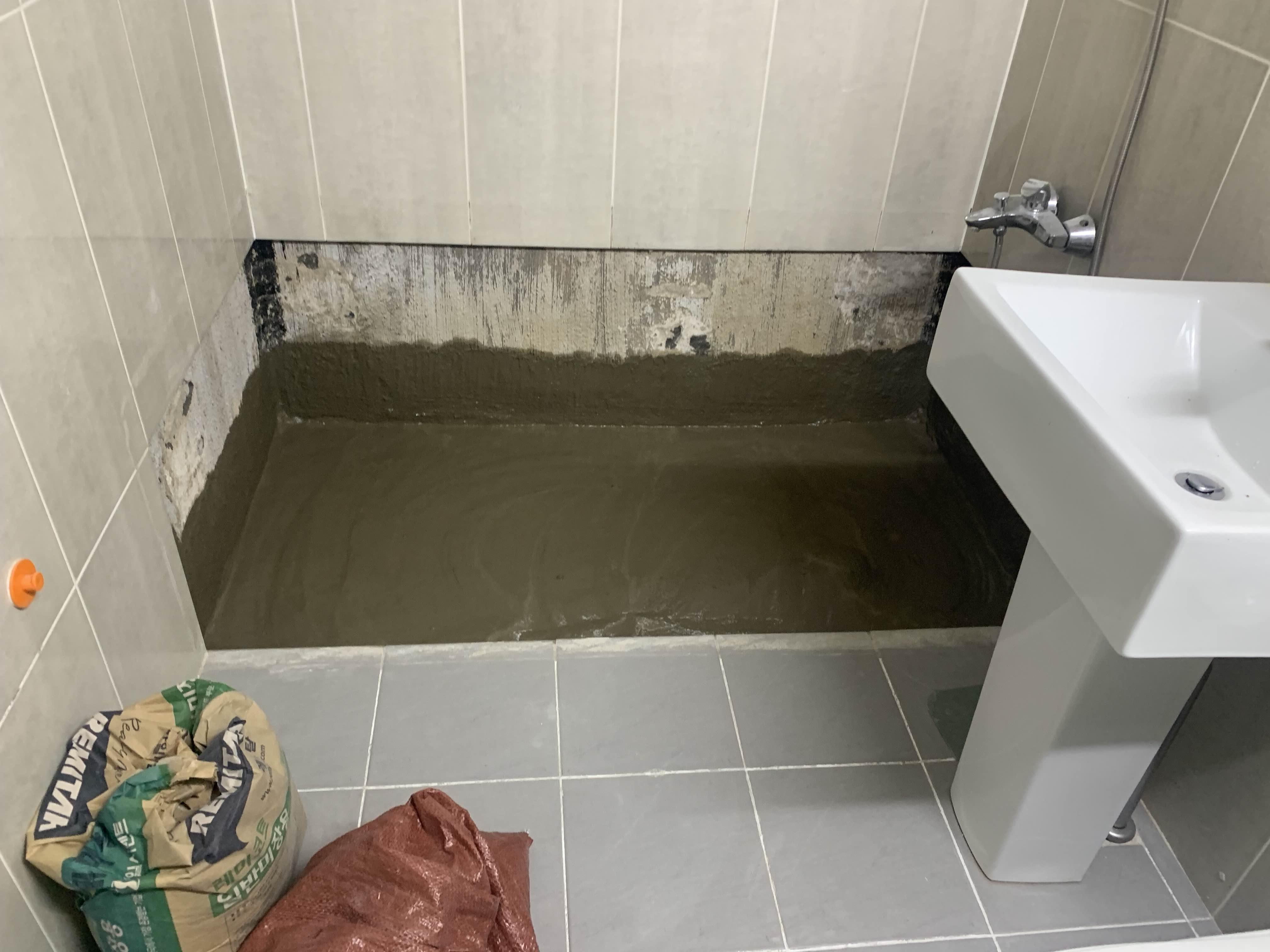 청소가 완료되었으면, 욕조 하부의 방수작업을 진행해준다. 방수는 시멘트 액체방수! 시멘트 액체방수는 두껍게 하면... 방수층이 깨지기 십상이다.