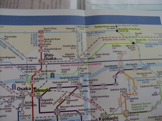 한규우메다역 => 미나미 이바라키 역 => 반파쿠키넨코엔역 => 한다이뵤인마에역