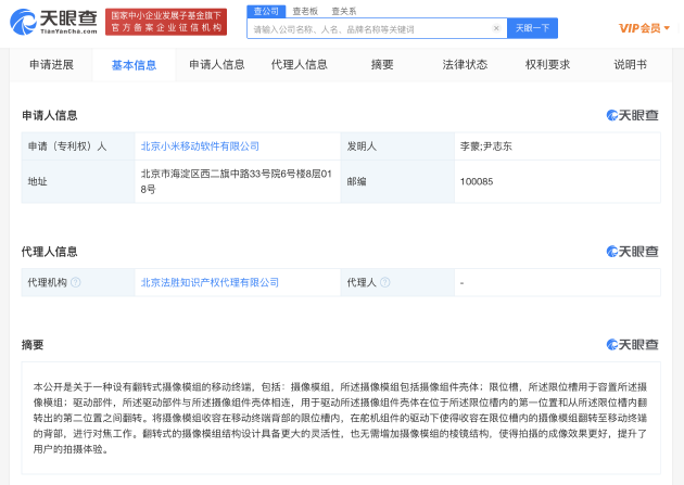 Sina Technology News는 11월 1일 오전 Tianyancha 앱에서 Beijing Xiaomi Mobile Software Co., Ltd. 가 11월 1일 "플립 카메라 모듈이 있는 모바일 단말기"에 대한 특허를 공개했다고 밝혔습니다.