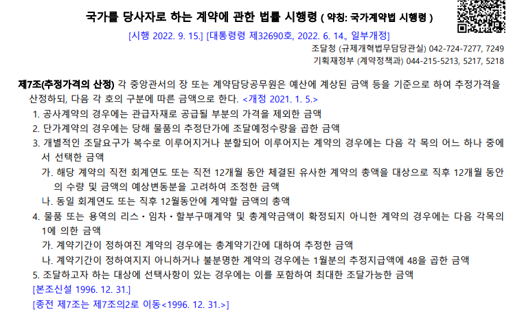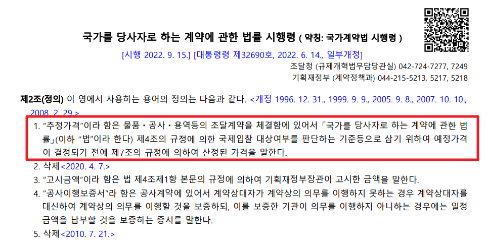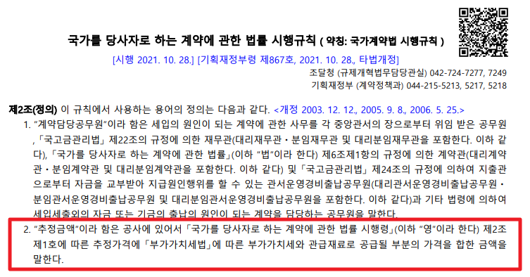 국가계약법 시행령 제2조(정의) 1항에서 추정 가격을 정의하고 있습니다.