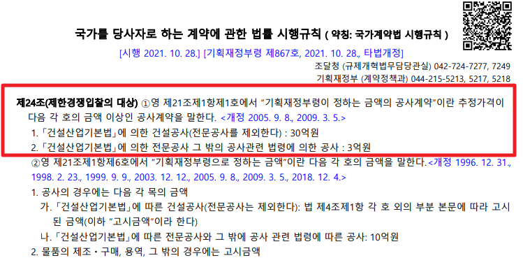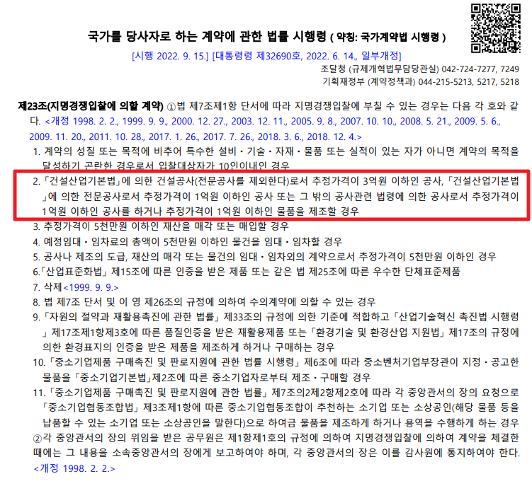 마지막으로 수의계약의 기준도 추정 가격입니다.
