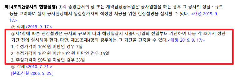 ③제1항에 따른 현장설명은 공사의 규모에 따라 해당 입찰서 제출 마감일의 전일부터 기산하여 다음 각 호에서 정한 기간 전에 실시해야 한다. 다만, 제35조 제4항의 경우에는 그 기간을 단축할 수 있다.