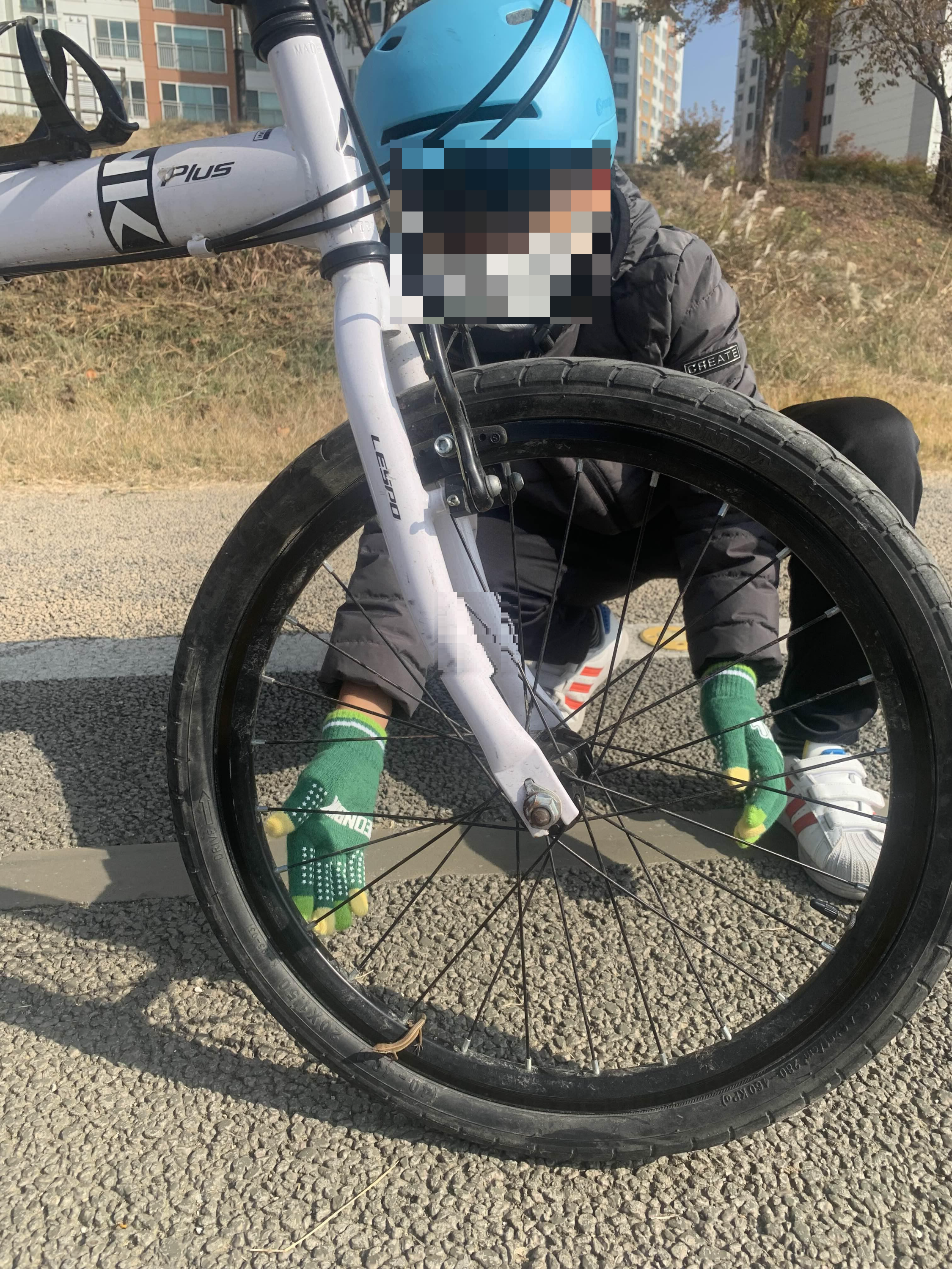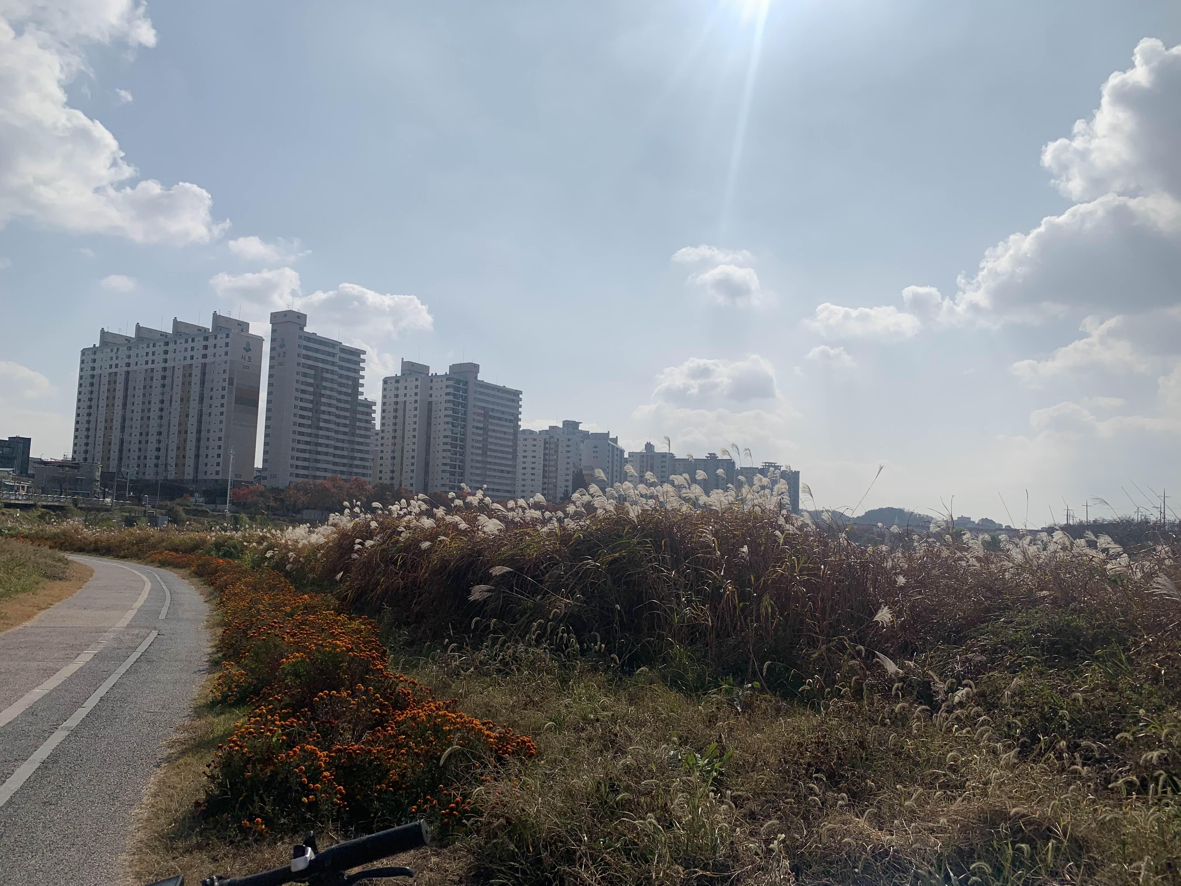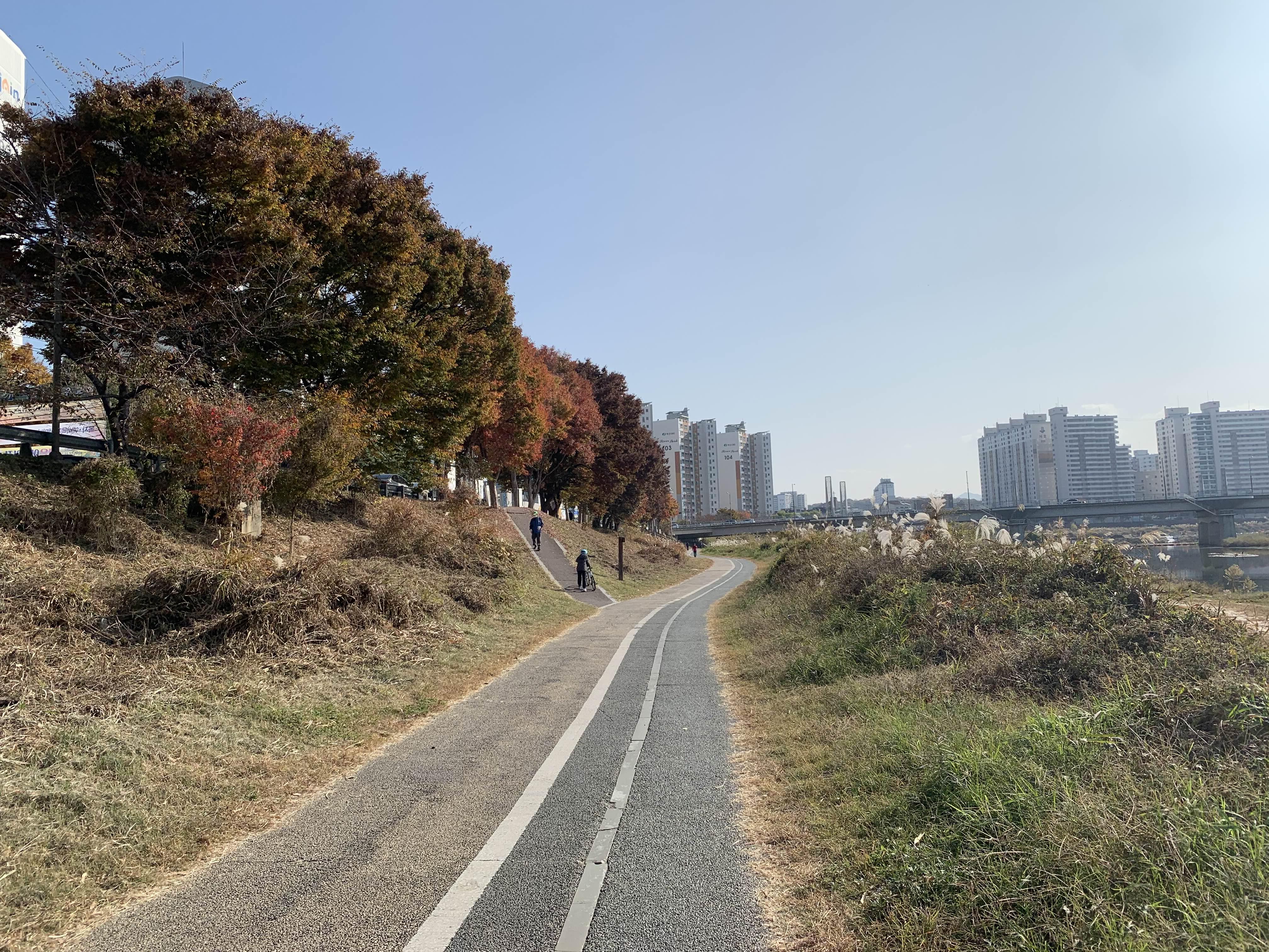 아이와 함께 전주천 자전거도로를 여행하였다. 자전거 도로 위 이상한 생명체가 보인다.