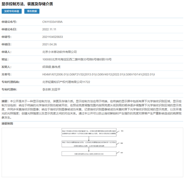 디스플레이 제어 측면에서 이 특허는 화면 아래 광학식 지문인식 영역의 디스플레이 밝기를 미리 설정된 밝기 조절 범위 내에서 밝기가 낮은 것부터 높은 순으로 단계적으로 조절하는 동시에 지문인식 영상을 수집할 수 있다.