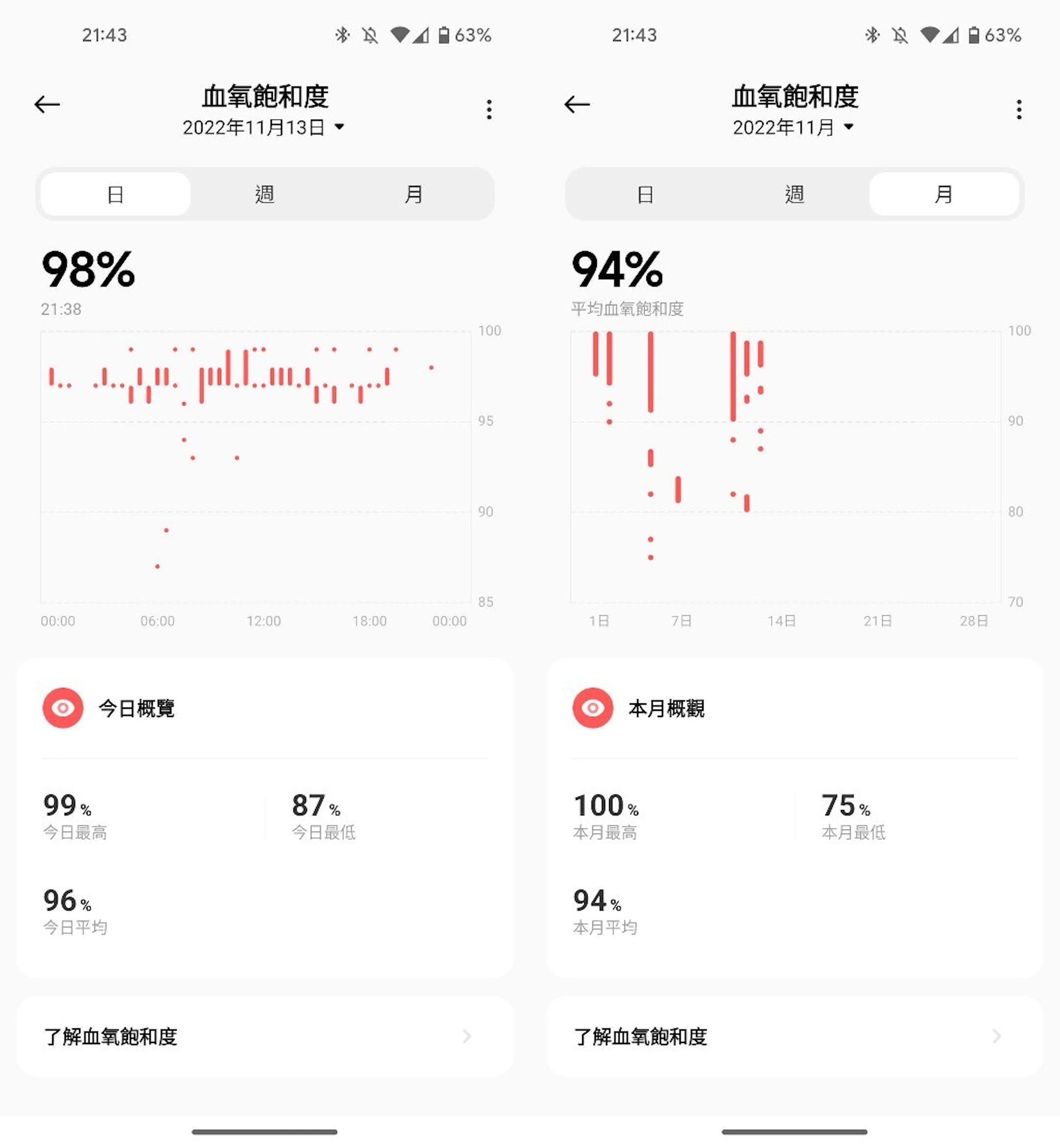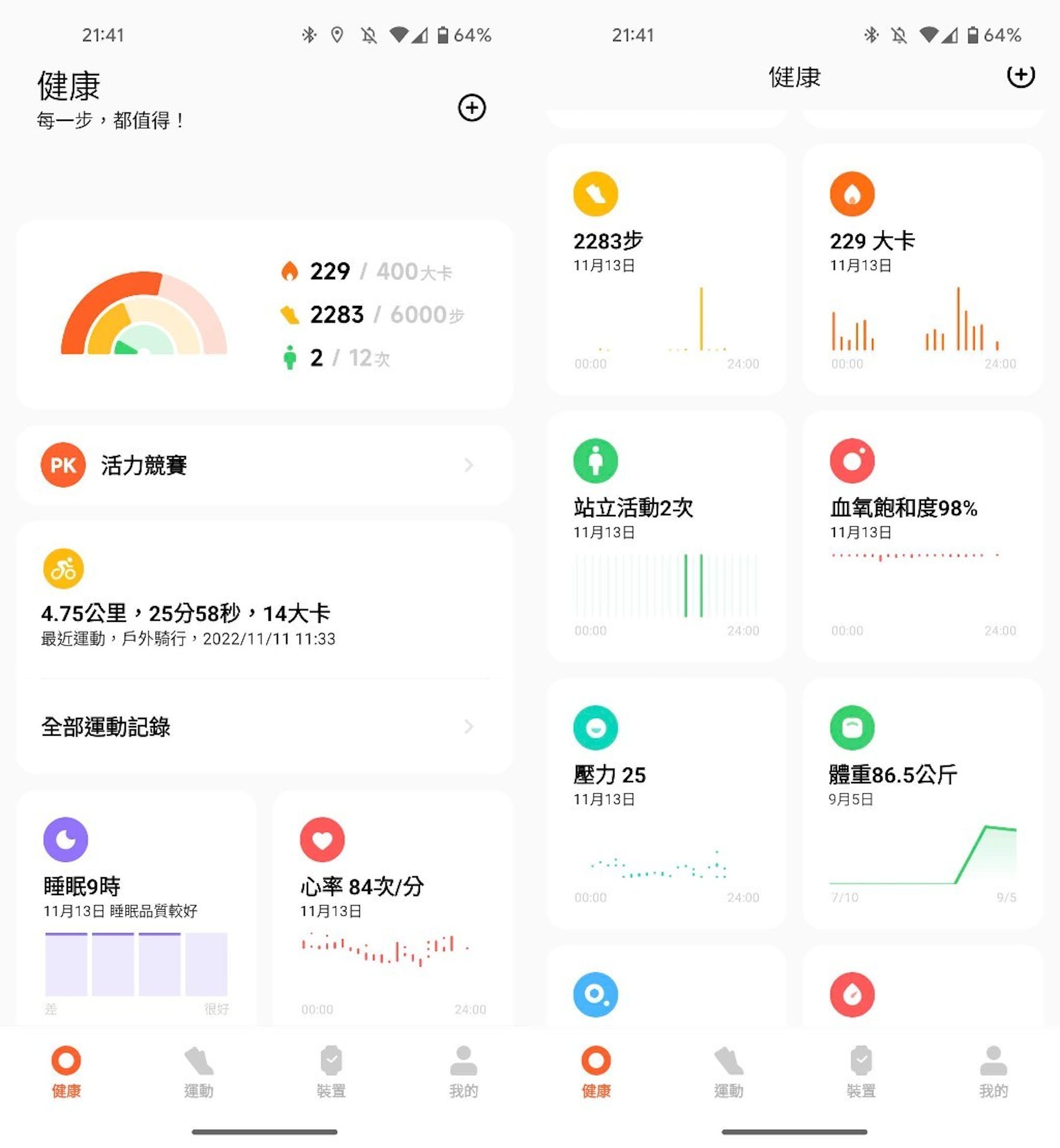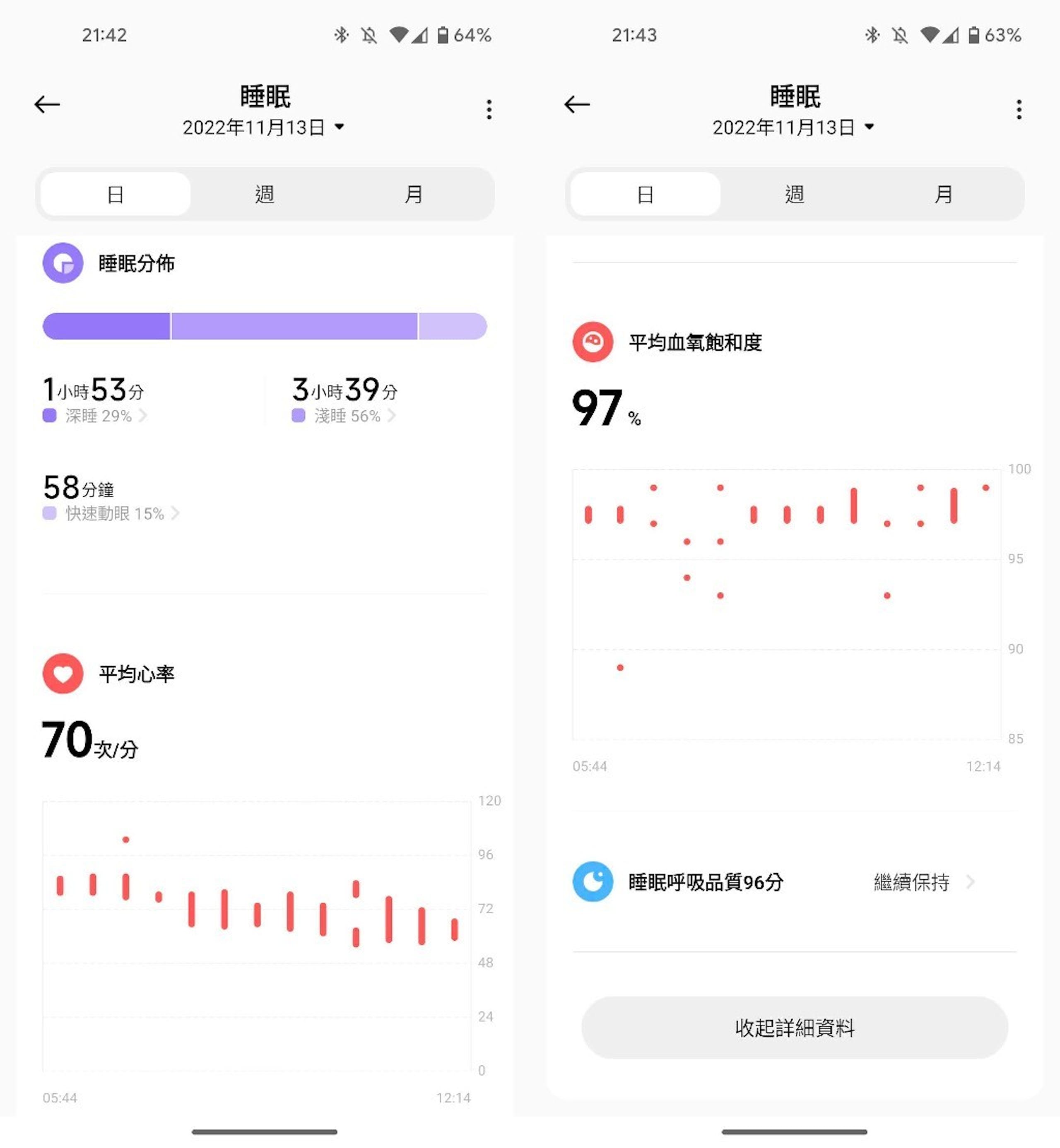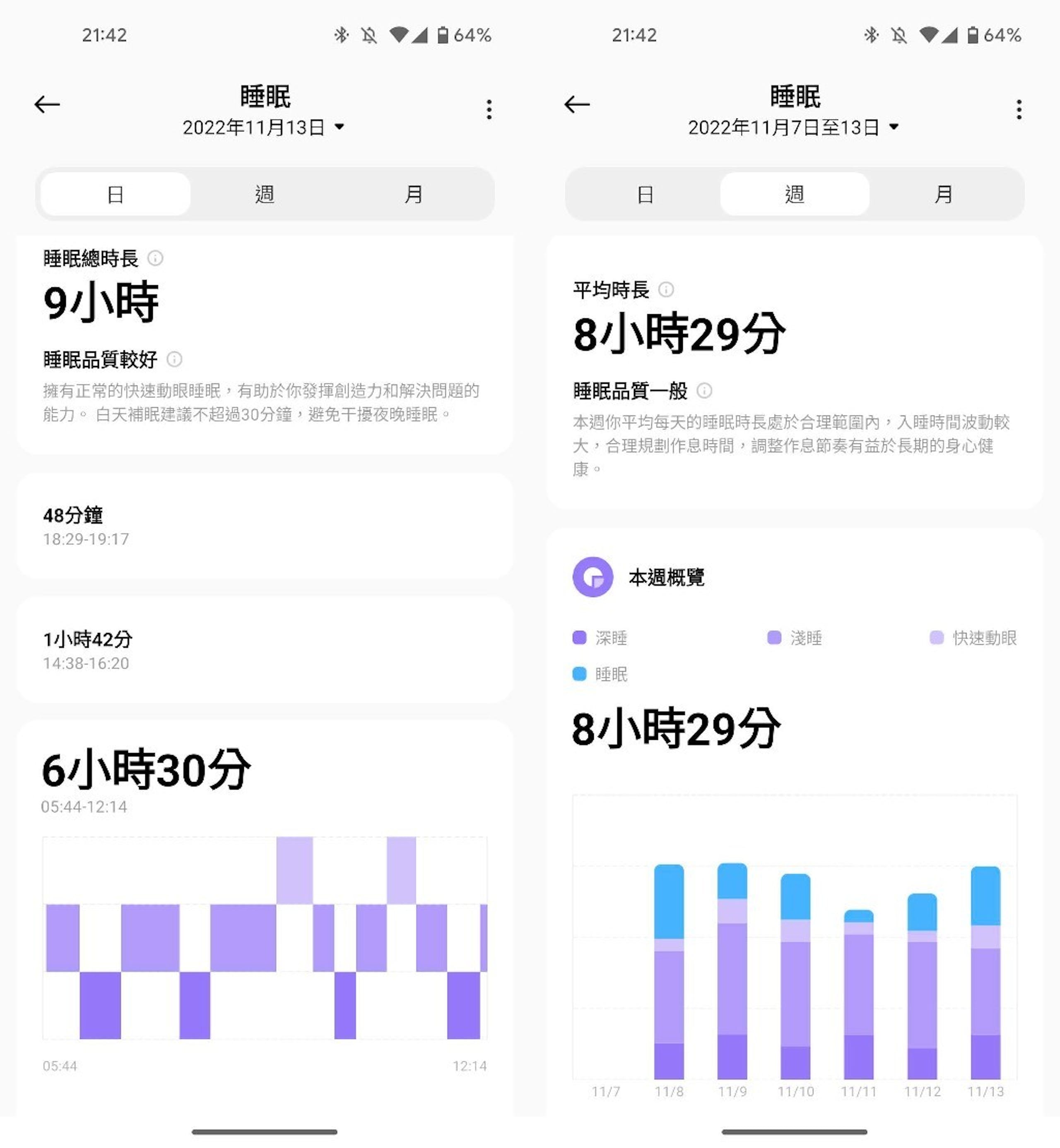 하드웨어 감지의 경우 24시간 심박수, 혈중 산소 및 압력 감지를 켤 수 있습니다. 수면의 경우 고정밀 수면 감지도 켤 수 있습니다. 심박수와 혈중 산소 상태를 동시에 기록하는 것 외에도 수면 중에는 메인 수면 시간이 아닌 경우에도 20분 이상의 수면도 기록되며, 장기간의 수면 패턴으로 수면 습관이 개선되는 것을 볼 수 있습니다.