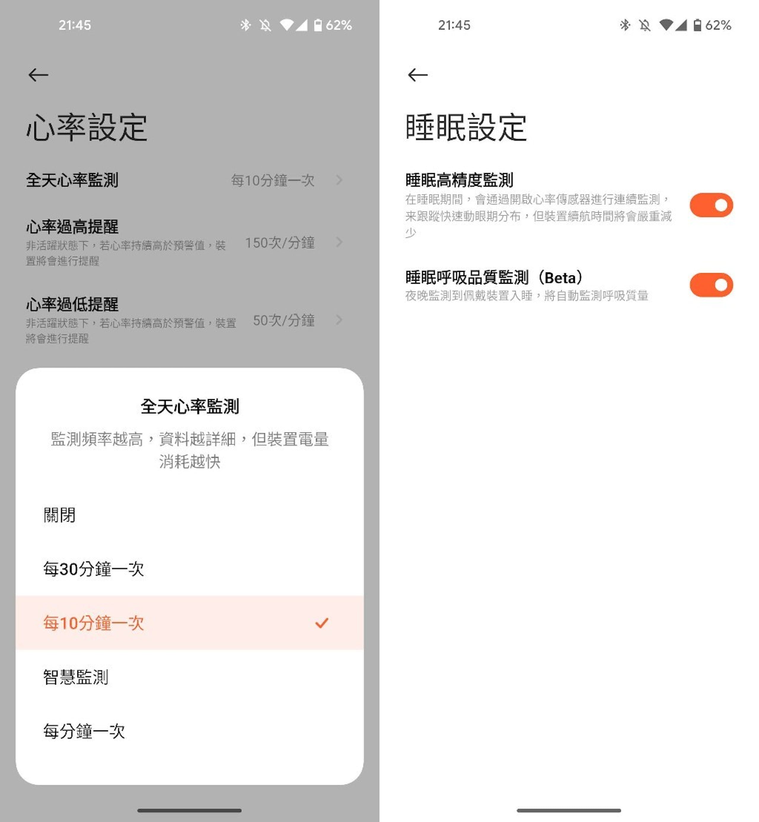▲ 심박수 감지의 경우 감지 빈도를 직접 선택할 수 있으며 일반적으로 10분마다 기록하는 것은 데이터와 배터리 수명을 모두 고려할 수 있습니다.