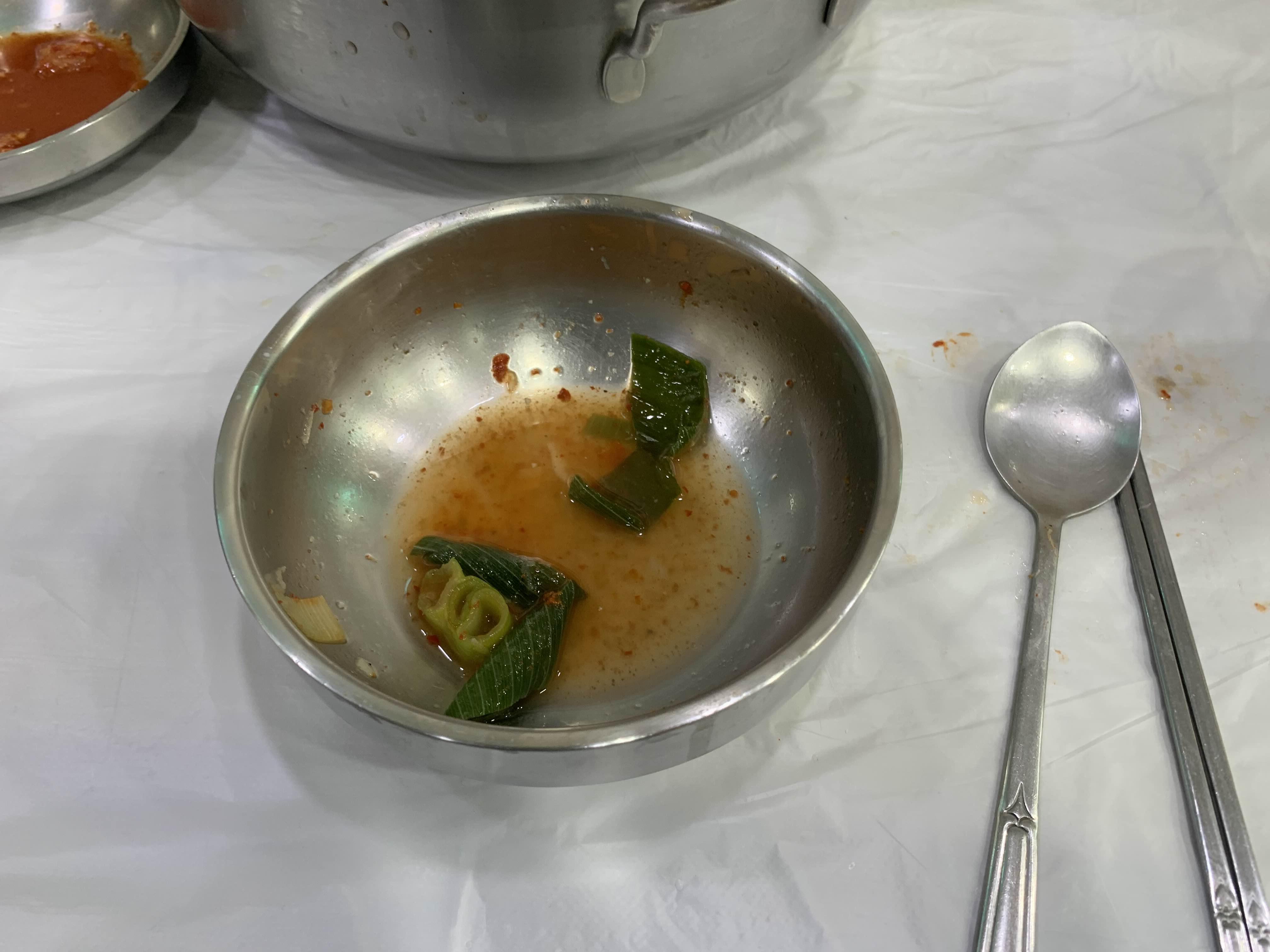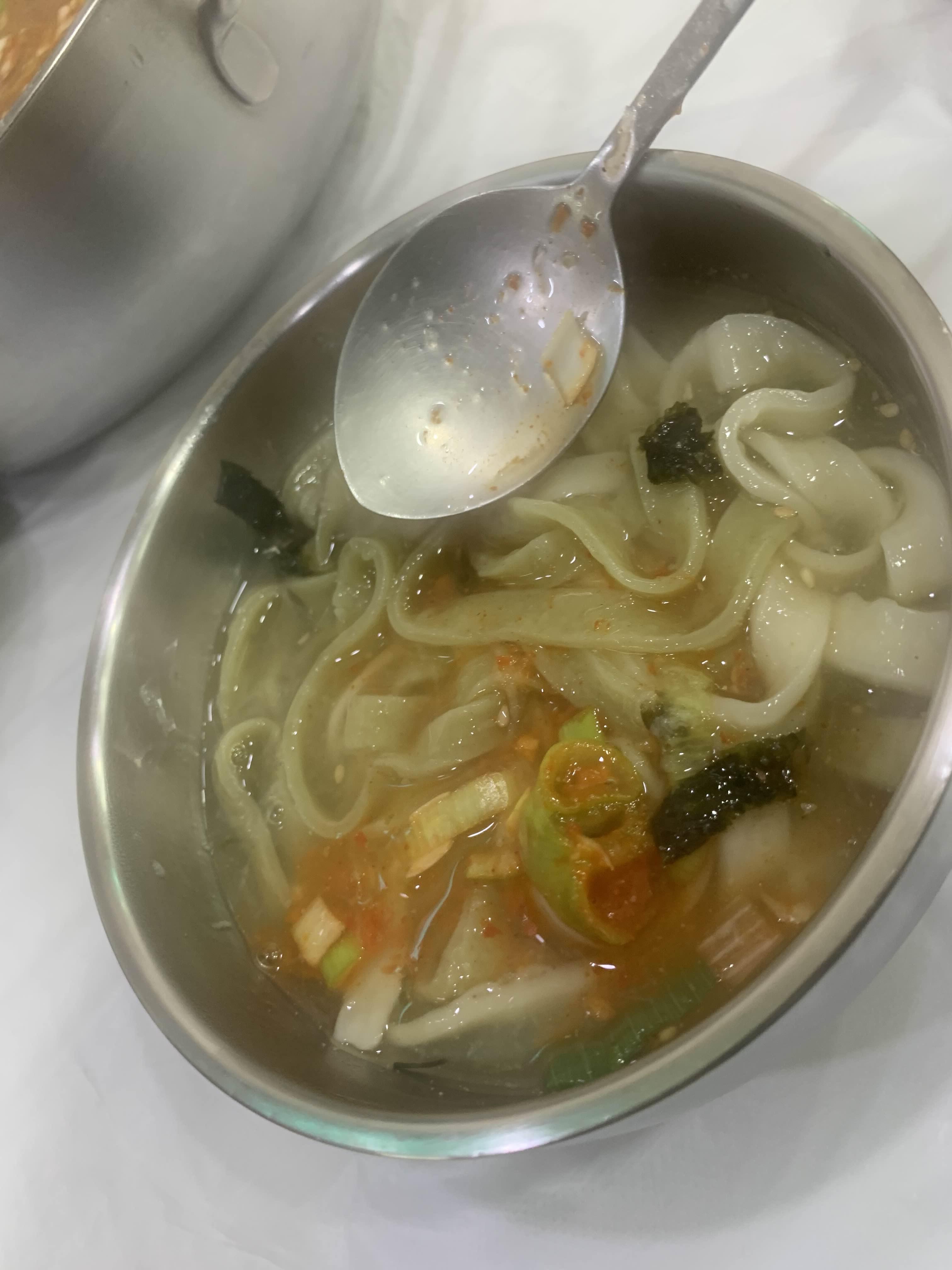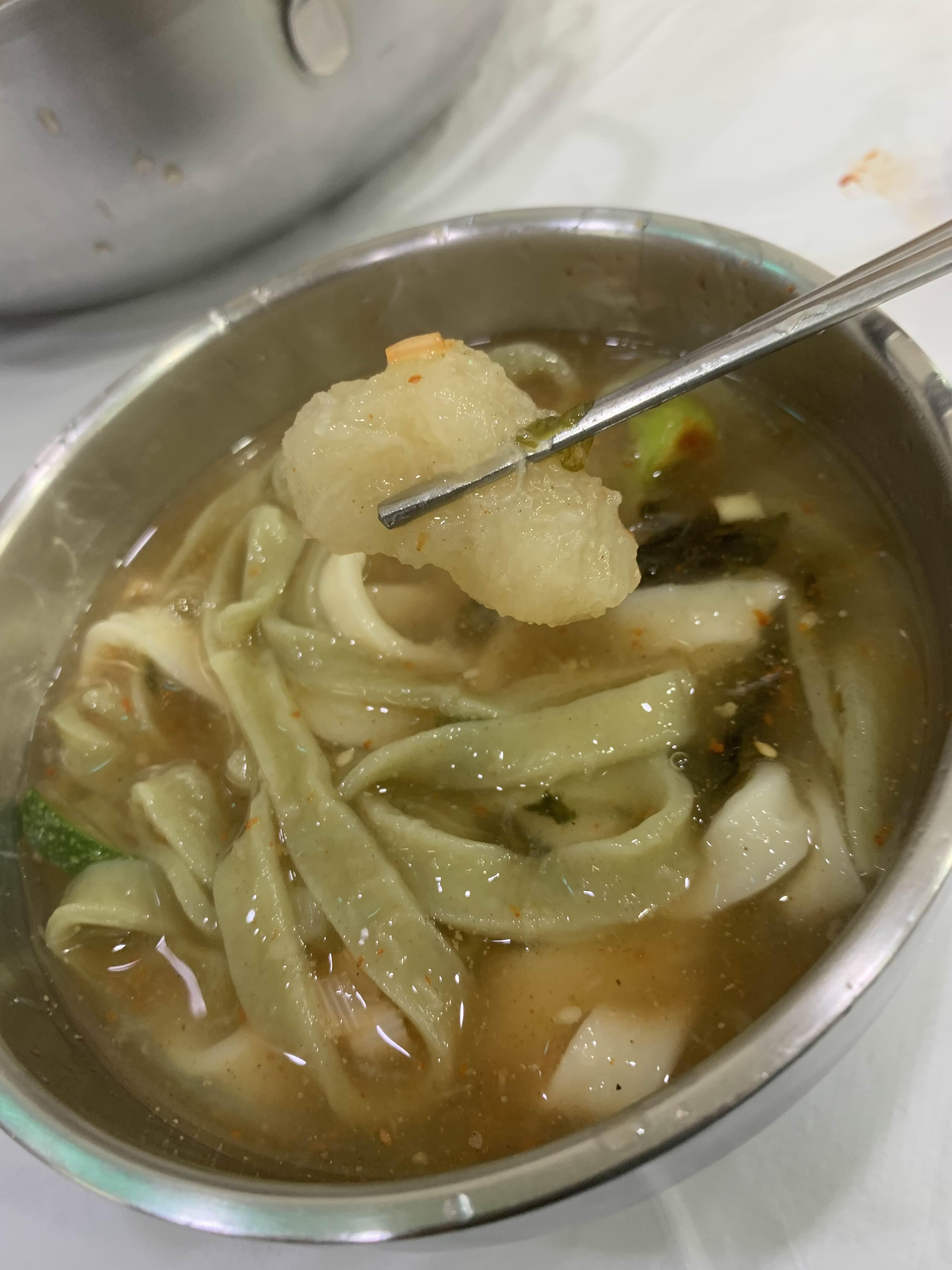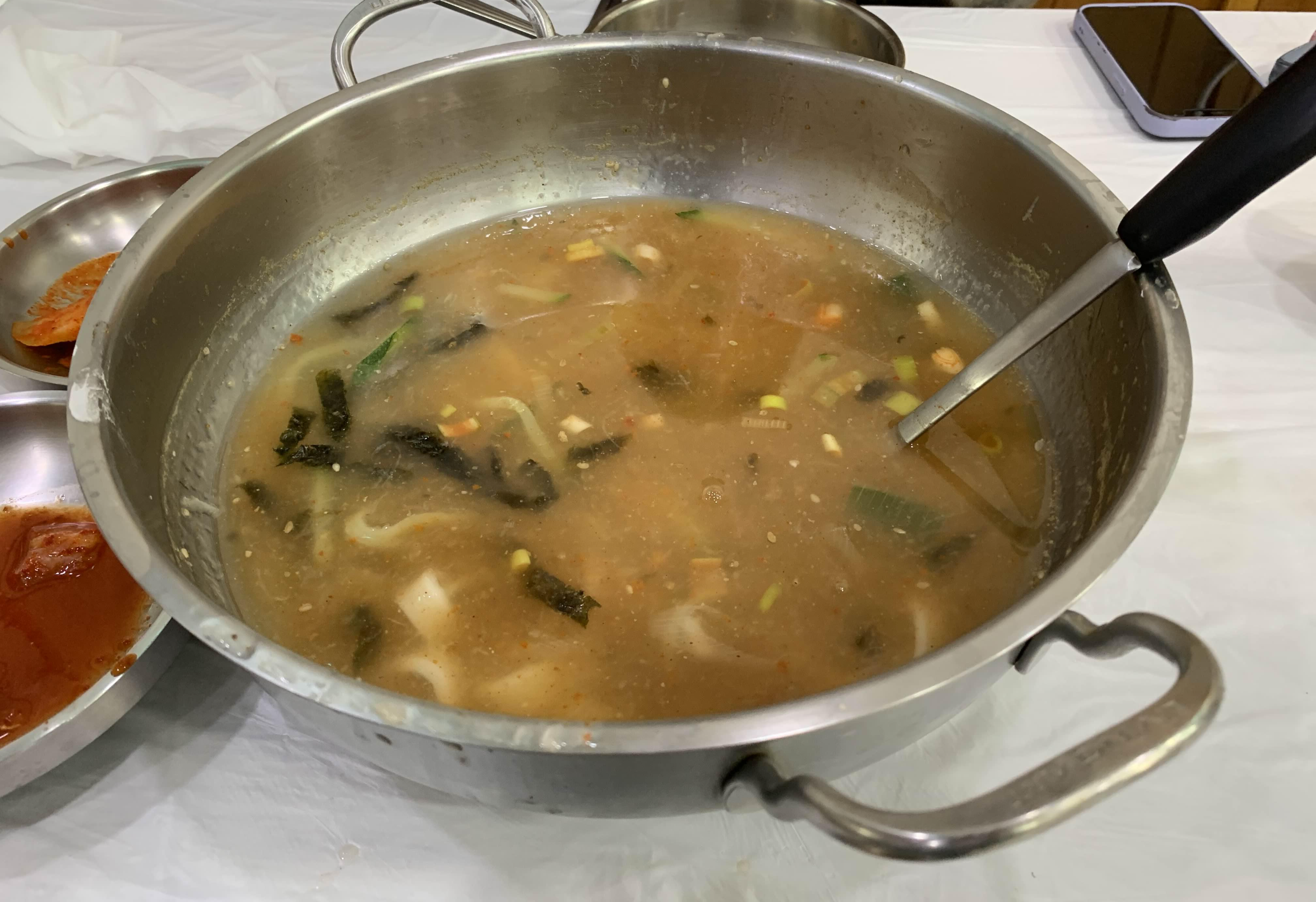 감자로 만든 새알 모양은 옹심이!! 비주얼은 흐물흐물해 보였습니다. 하지만, 옹심이 식감은 찹쌀떡이 약간 굳어서 쫄깃한 식감이 나더군요. 칼국수의 국물 위 양념장이 올려져 있는데.. 이 양념장을 썩지 않으면, 국물이 구수하다가 양념장을 쌀 짝 썩어주면 얼큰한 국물로 변화되더군요.