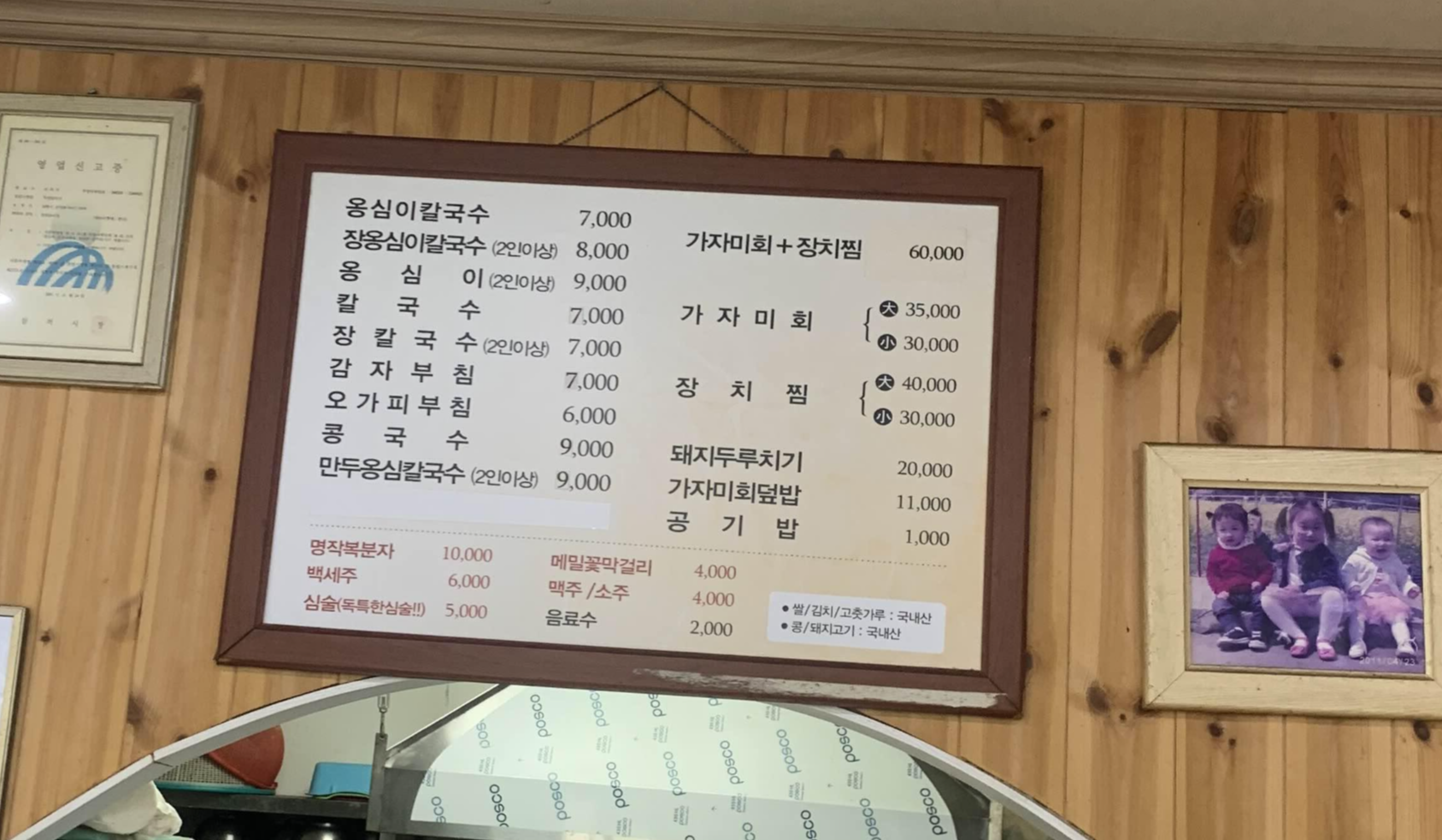 다른 테이블 음식을 스캔하고 메뉴판을 보았는데... 다른 테이블 음식이 무슨 음식인지 모르겠더군요.ㅎㅎ 그래서 물어보았더니 옹심이 칼국수를 드신다고 하시더군요. 주문받으시는 분에게 어떤 음식이 잘 나가냐고 물어보니 옹심이 칼국수와 장 칼국수가 가장 많이 나간다고 하더군요. 메뉴판의 가장 위 메뉴는 옹심이 칼국수를 2개 주문했습니다. 1인분에 7,000원으로 가격은 그리 비싸지 않더군요.