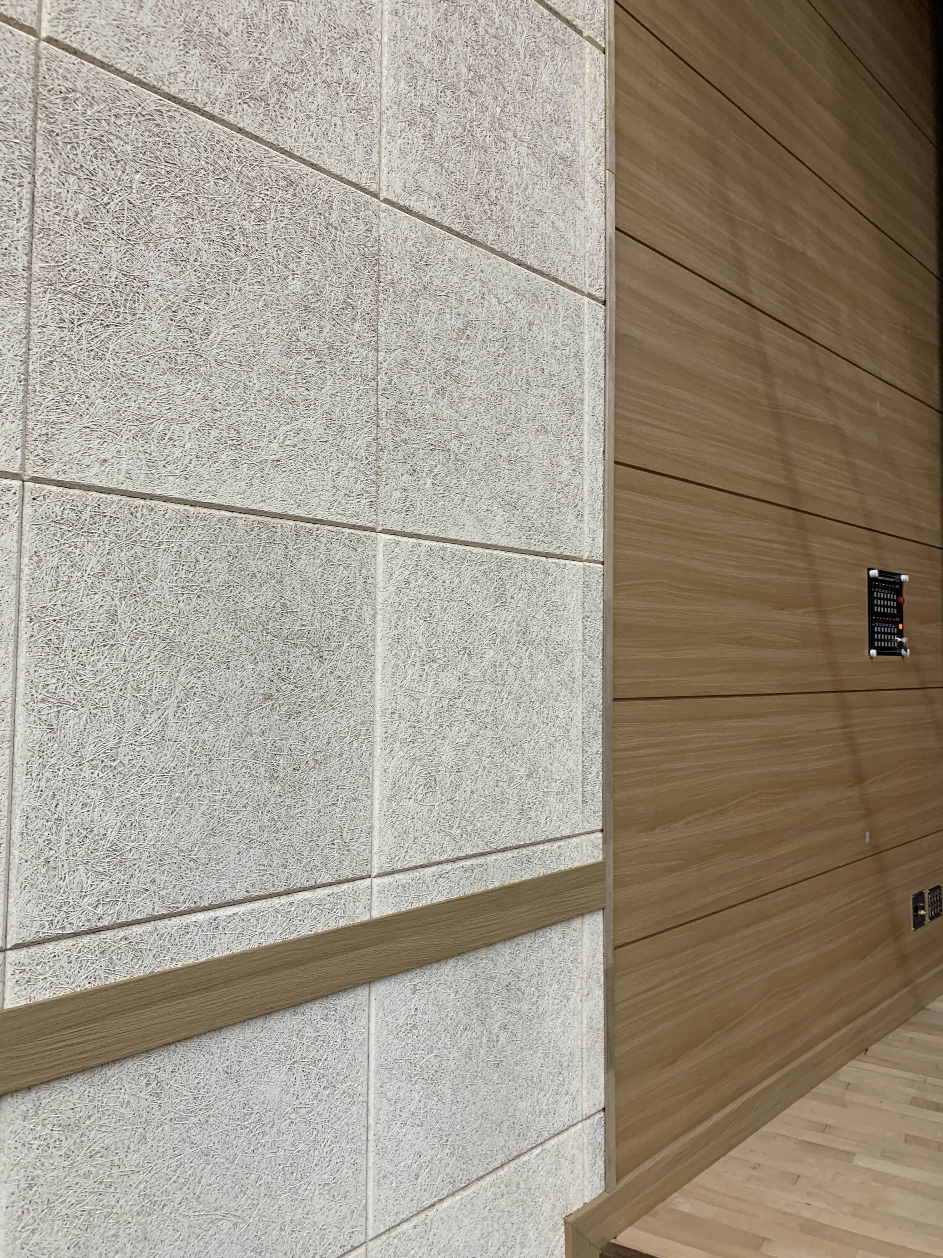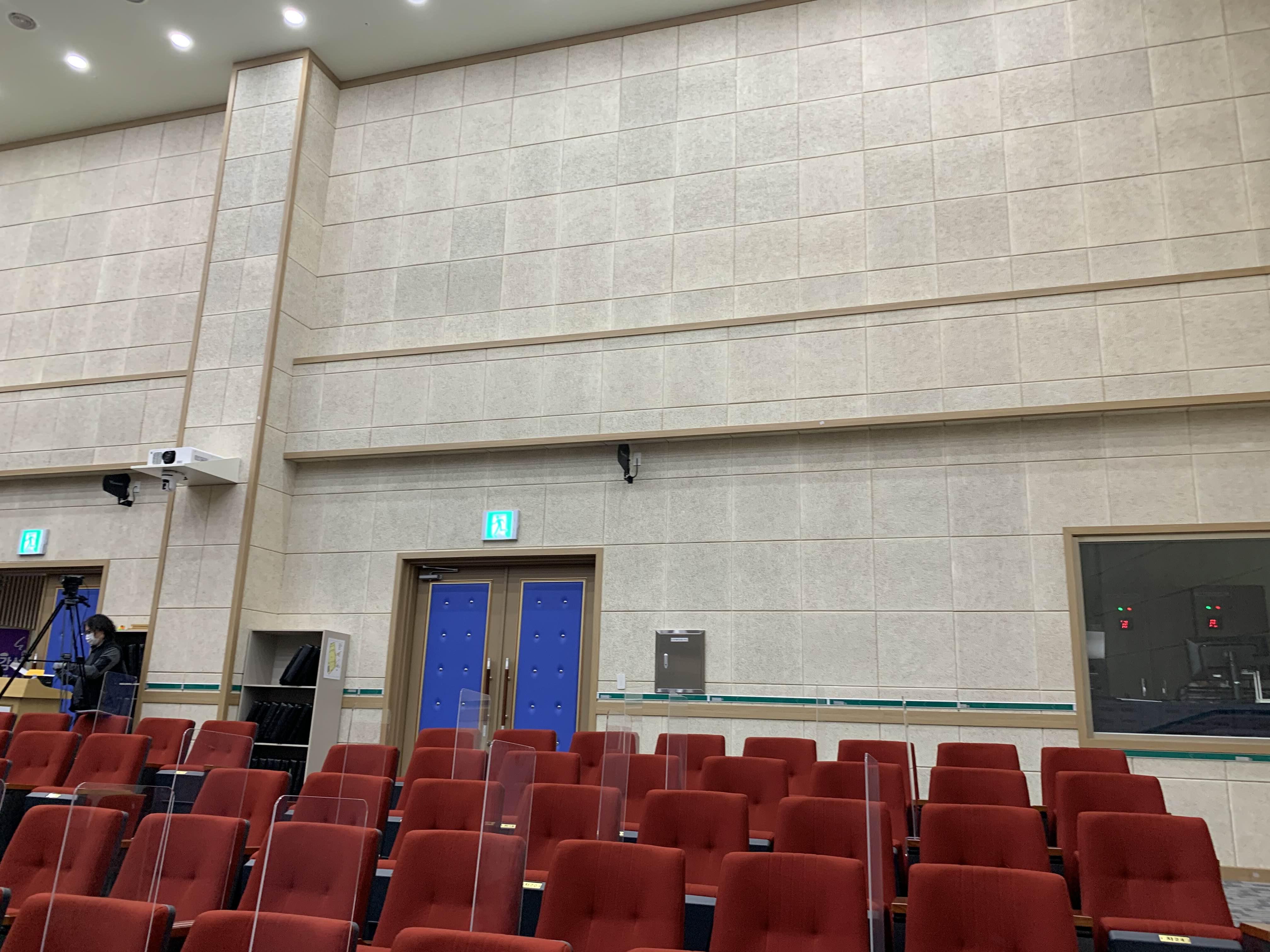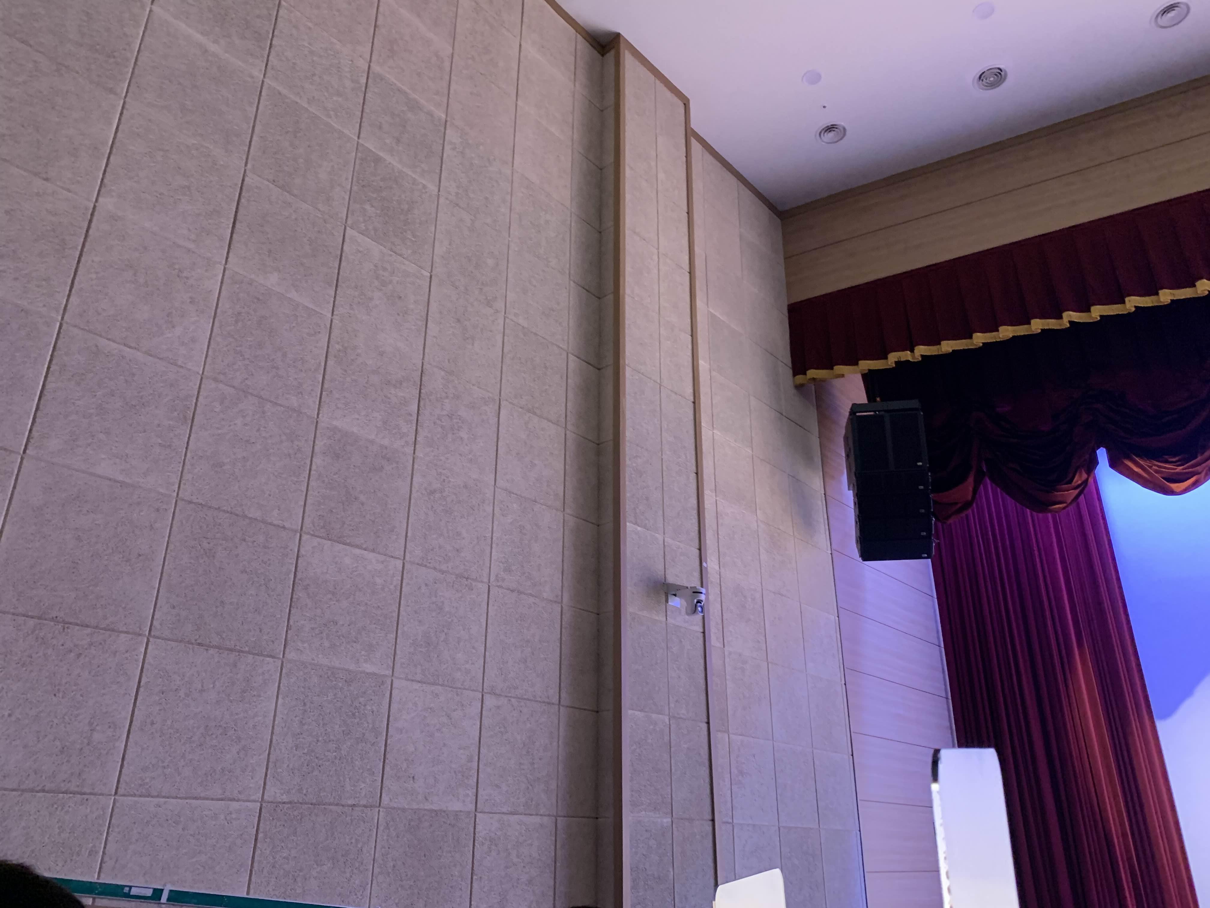 공연이 끝나고... 공연장 시설을 구경중! 공연장의 천정은 반사판, 관객의 뒤, 옆면은 흡음판을 설치합니다. 공연장의 소리 울림을 조절해주는 벽체의 마감재~.