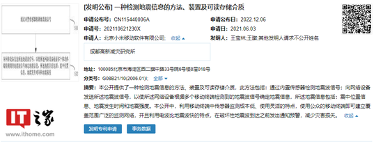 12월 6일 자 IT House 뉴스에 따르면, 국가 특허청의 중국 특허 공개 공고(출원 공개 번호: CN115440006 A)에 따르면, Beijing Xiaomi Mobile Software Co., Ltd. 및 Chengdu High-tech Disaster Reduction Research Institute "지진 정보 감지 방법 및 장치" 및 가독성 저장 매체" 특허 공개 출원.