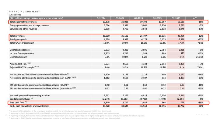 테슬라는 심각한 어려움에 직면해 있다. 7월 24일 베이징 시간, 테슬라는 2분기 재무 보고서를 발표했습니다. 전반적으로 1분기의 급격한 감소세는 멈췄지만, 전년 동기 대비 뚜렷한 하락세를 보이고 있습니다. 그중 총매출은 225억 달러로 전년 동기 대비 12% 감소했고, 자동차 사업 매출은 166억 7천만 달러로 전년 동기 대비 16% 감소했습니다. AI 사업 투자 증가로 인해 잉여현금흐름은 전 분기 6억 6천만 달러에서 1억 5천만 달러로 계속 감소했습니다. 머스크가 2분기에 "사임"하고 복귀하여 6월 오스틴에서 로보택시 사업을 시작했지만, 테슬라의 매출은 전년 대비 감소세를 막지 못했습니다. 미국에서는 "빅 앤 뷰티풀(Big and Beautiful)" 법안 시행 이후 소비자 측면에서 더 심각한 어려..